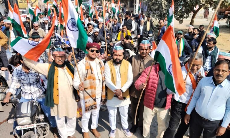 आगरा। गणतंत्र दिवस के शुभ अवसर पर सिस्टम सुधार संगठन (किसान) द्वारा तिरंगा संविधान सम्मान रैली मिट्टी शहादत शहीदी संघर्ष तिरंगा संविधान के सम्मान में तथा महापुरुषों एवं वीरों के विचारधारा को आगे बढ़ाने के संकल्प को लेते हुए ऐतिहासिक रैली मोटरसाइकिल वाहनों से निकाली गई, सर्वप्रथम गांव सवाई सरकारी बीज गोदाम कार्यक्रम स्थल पर कार्यक्रम के मुख्य अतिथि भारतीय सेना से रिटायर्ड पूर्व डीजीपी श्री राम अवतार जी एवं क्षेत्र के सम्मानित बुजुर्गों के कार्यक्रमों द्वारा ध्वजारोहण किया गया, उसके पश्चात यह तिरंगा यात्रा शुरू हुई जो कि एत्मादपुर तहसील के दर्जन भर से अधिक गांवों तथा कस्बा एत्मादपुर से होकर निकाली गई तथा वापस गांव सवाई पर ही इस यात्रा का समापन किया गया, इस यात्रा ने 20 किलोमीटर की दूरी तय की तथा अधिक से अधिक गांवों में पहुंचने का प्रयास किया गया सभी सम्मानित गांव गरीब किसान मजदूरों तथा संघर्ष के साथियों ने बड़ी ही मजबूती से इस यात्रा को सफल बनाया तथा सभी ने संकल्प लिया कि सभी लोग मिलकर हाल तथा हालात दोनों को बदलेंगे तथा अपनी वाजिब हकों की लड़ाई संवैधानिक अधिकारों के तहत गांधीवादी तरीके से लड़ाई को लड़ेंगे,
