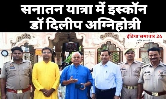 मथुरा। मथुरा के इस्कॉन मंदिर अतिथि कक्ष में मुख्य जन सम्पर्क अधिकारी द्वारा राज्य सूचना आयुक्त डॉ दिलीप अग्निहोत्री को सम्मानित किया गया। राज्य सूचना आयुक्त ने मंदिर में पूजा अर्चना की। उन्होंने इस्कॉन संस्थापक श्रील प्रभुपाद के निवास स्थान को भी देखा। स्वामी प्रसन्नचित दास ने अवगत कराया कि इसको अब संग्रहालय में परिवर्तित कर दिया गया है। यहां की रसोई में प्रतिदिन श्रील प्रभु पाद के लिए प्रसाद बनता है। भोग लगा कर उसे भक्त जनों में वितरित किया जाता है। मंदिर परिसर में भगवान श्री राधा कृष्ण भव्य पेंटिंग लगी हैं। यह अन्यत्र दुर्लभ हैं। क्योंकि यह पेंटिंग विशेष हैं। श्रील प्रभुपाद अपने शिष्यों को बताते थे कि उन्होंने रात्रि में प्रभु को किस रूप में देखा। शिष्य उनके वर्णन के अनुसार चित्र और पेंटिंग बनाते थे। श्रील प्रभुपाद ने मात्र पंद्रह बार पूरी पृथ्वी का भ्रमण किया था। अमेरिका में इस्कान की स्थापना की।सबसे ज्यादा भागवत गीता बाँटने का कीर्तिमान बनाया। दुनिया में सबसे ज्यादा विदेशियों को सनातन धर्म का भक्त बनाया। रथयात्रा निकालने की परंपरा शुरू की। विदेशी भी हरे कृष्ण का जाप करने लगे। शाकाहारी बन गए।