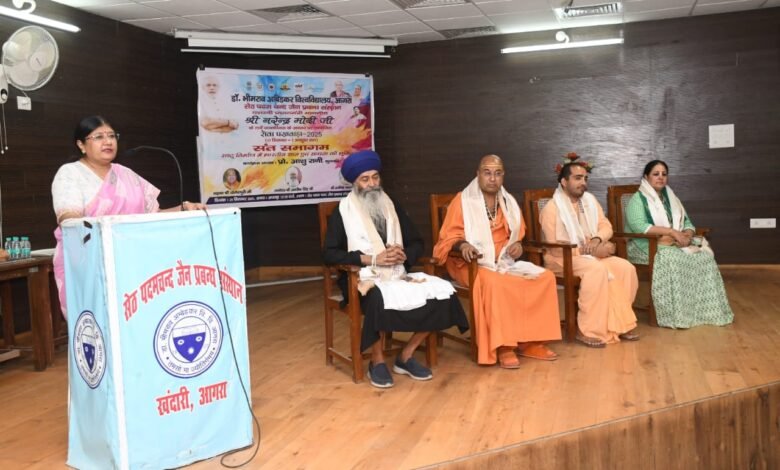 आगरा। डॉ. भीमराव अंबेडकर विश्वविद्यालय, आगरा के सेठ पदमचंद जैन संस्थान में “सेवा पखवाड़ा 2025” के अंतर्गत आयोजित संत समागम में छात्रों और शिक्षकों ने भाग लिया। यह कार्यक्रम 23 सितम्बर 2025 को संपन्न हुआ। संचालन प्रो. संतोष बिहारी ने किया।